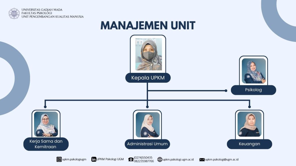 Manajemen 10 December 2025, 10.00 Oleh: arih 0 Secara organisasi UPKM bertanggung jawab langsung kepada Dekan Fakultas Psikologi UGM, dengan struktur tim manajemen sebagai berikut: